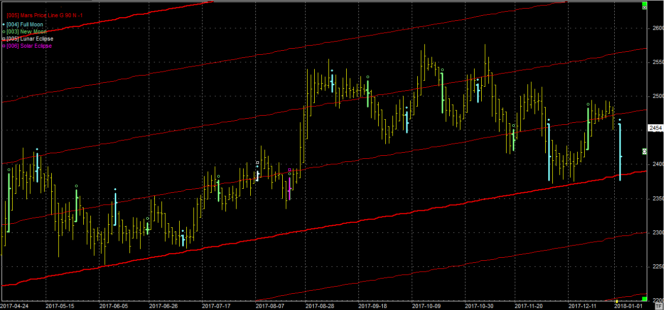 Na wykresie z liniami Marsa byki nie mogą uporać się z oporem na linii w okolicach 2460 pkt. Pełnia jaka będzie 02.01.18 na pewno w tym nie pomoże. Oczekuje korekty, a od jej głębokości zależeć będzie czy zobaczymy kolejny atak na opór, czy zjazd do wsparcia na 2390 pkt,
