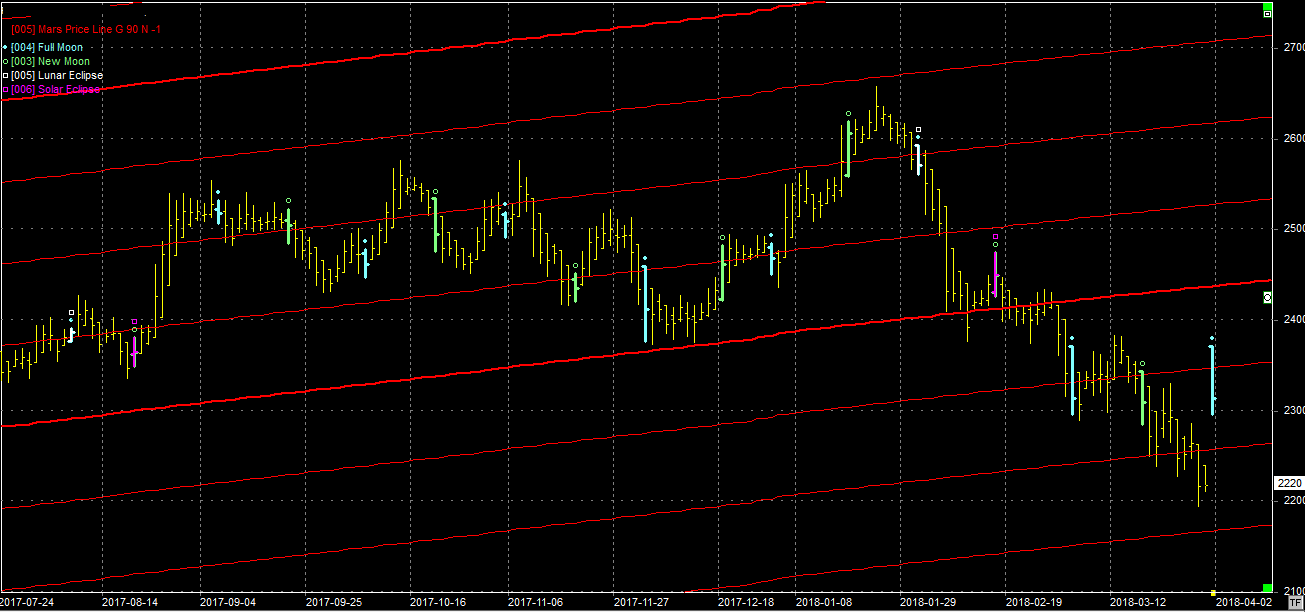 Na wykresie z liniami Marsa widzimy naruszenie linii wsparcia na poziomie 2250 pkt. Nie jest to jeszcze przełamanie ale brakuje niewiele. Nadzieją dla byków może być pełnia jaka uściśliła się 31.03.18. Nadchodzący tydzień jest więc kluczowy. Jeśli zamkniemy się wyżej, to będzie szansa na ustanowienie krótkoterminowego przynajmniej dołka.