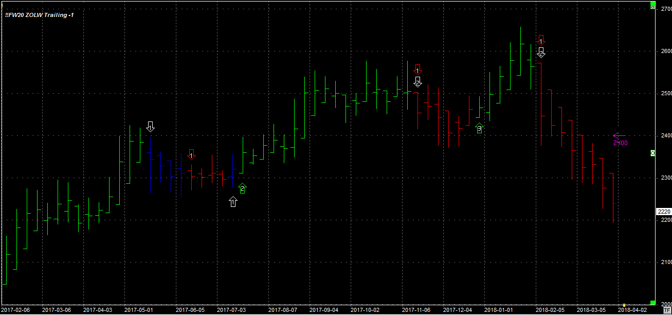 Tydzień zamknął się na poziomie 2220 pkt., 32 pkt. niżej niż tydzień temu. System utrzymuje pozycję krótką - 1 szt. po 2391 pkt. Stop 2400 pkt.
