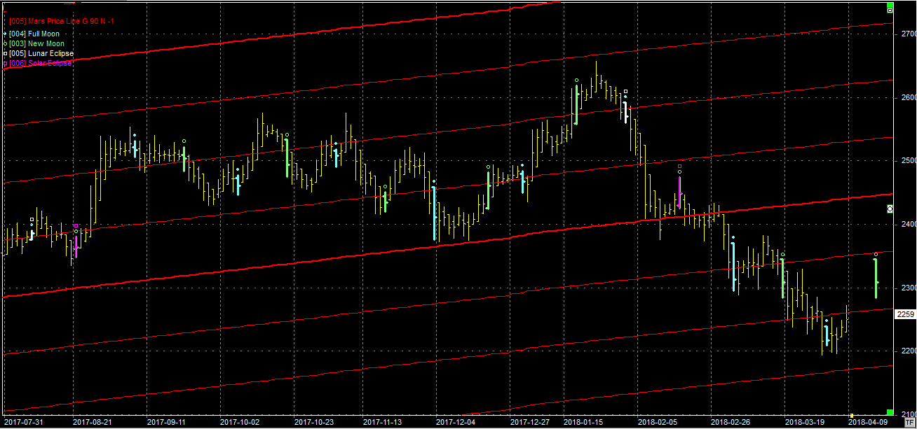 Na wykresie z liniami Marsa widzimy naruszenie linii wsparcia na poziomie 2250 pkt. Nie jest to jeszcze przełamanie ale brakuje niewiele. Nadzieją dla byków może być pełnia jaka uściśliła się 31.03.18. Nadchodzący tydzień jest więc kluczowy. Jeśli zamkniemy się wyżej, to będzie szansa na ustanowienie krótkoterminowego przynajmniej dołka.