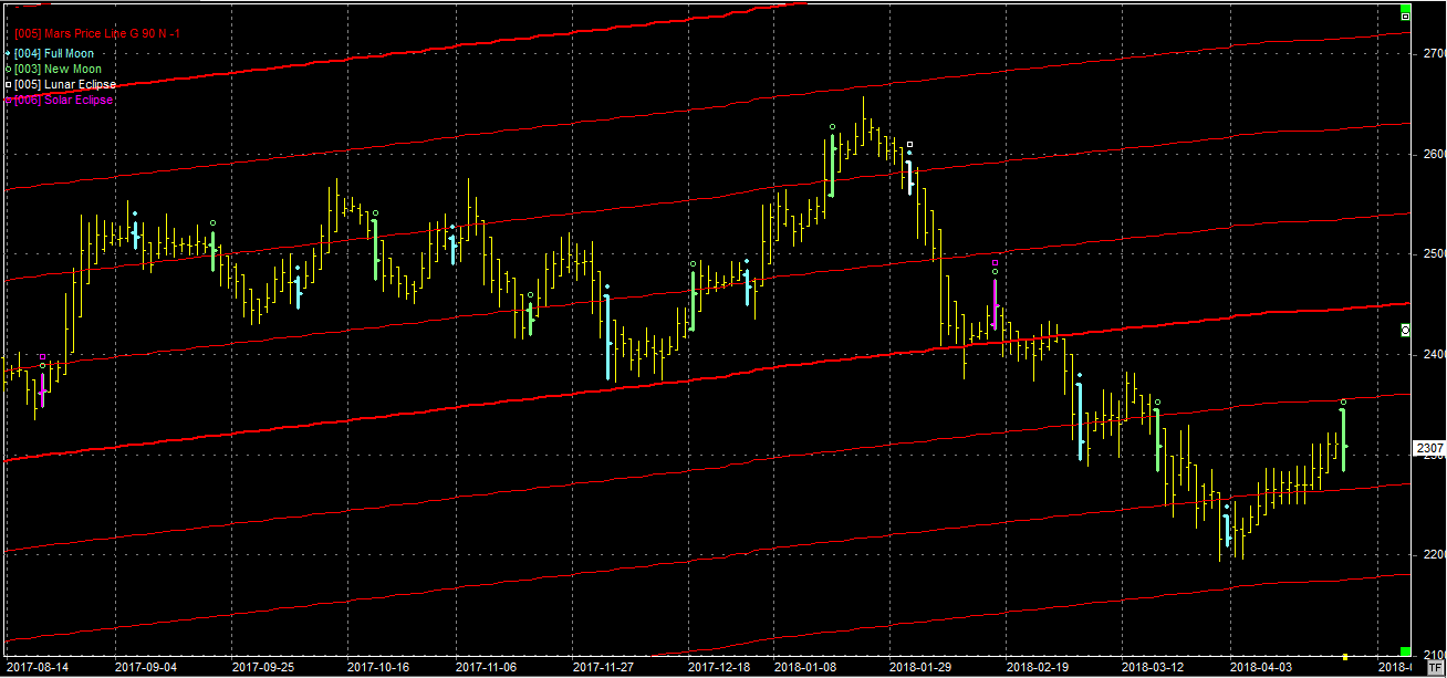 Na wykresie z liniami Marsa widzimy nadal walkę o wsparcie na poziomie 2260 pkt. Walka trwa od dwóch tygodni, więc linia wsparcia ucieka do góry, zgodnie z ruchem postępującym planety. Na razie bykom udaje się wybronić to wsparcie. Ostatnia pełnia pomaga w wyznaczeniu dołka. Nastepny opór to poziom 2350 pkt. Niższe wsparcie, w przypadku przełamania obecnego, to poziom 2170 pkt.