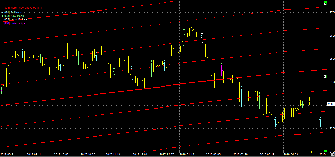 Na wykresie z liniami Marsa podejście pod opór na poziomie 2360 pkt. zostało zatrzymane wcześniej. Możliwe, że to przystanek przed decydującym atakiem. Następna pełnia dopiero 30.04, więc czasu na podejście jeszcze trochę jest. Piątkowe zamknięcie wypadło w połowie drogi pomiędzy wsparciem a oporem, więc taki atak jest nadal możliwy.