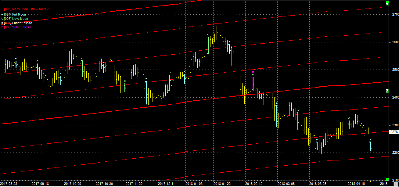 Na wykresie z liniami Marsa widzimy zejście do przełamanego oporu na poziomie 2280 pkt. Tu spadek musi się zatrzymać, jeśli myślimy o wzrostach. Przełamanie tego wsparcia to niechybnie test minimów, z możliwością ich przełamania. Koniec korekty spadkowej może wyznaczyć poniedziałkowa pełnia. Niestety poszatkowany tydzień majowy nie będzie sprzyjał aktywności na parkiecie.