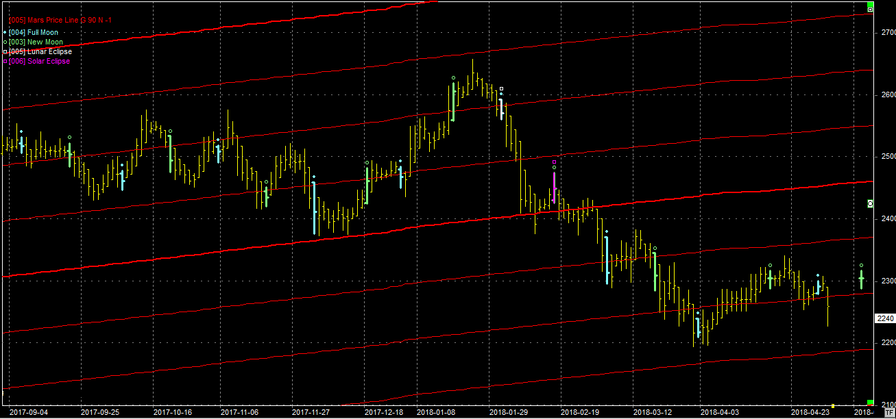 Na wykresie z liniami Marsa widzimy zejście do przełamanego oporu na poziomie 2280 pkt. Tu spadek musi się zatrzymać, jeśli myślimy o wzrostach. Przełamanie tego wsparcia to niechybnie test minimów, z możliwością ich przełamania. Koniec korekty spadkowej może wyznaczyć poniedziałkowa pełnia. Niestety poszatkowany tydzień majowy nie będzie sprzyjał aktywności na parkiecie.