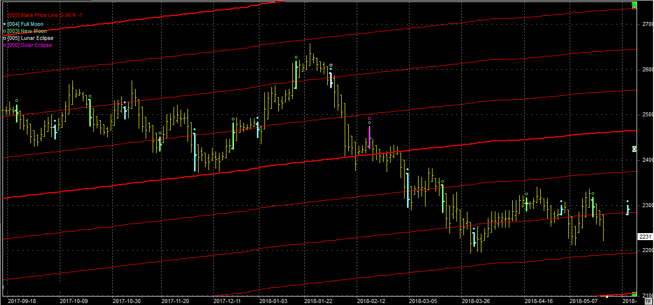 Na wykresie z liniami Marsa mamy już chyba decydującą utratę wsparcia na poziomie 2280 pkt. Obecnie kurs powinien zmierzać do kolejnego, znajdującego się na poziomie 2200 pkt. Trend spadkowy jest bardzo wyraźny, więc i te pewnie padnie po kilku próbach. Niżej mamy linię Marsa na poziomie 2100 pkt. W dłuższej perspektywie, jeśli ostatnia korekta horyzontalna miałaby być jedynie przystankiem w większym ruchu, a na to się zanosi, to równość fal spadkowych wskazuje na możliwość spadku nawet w okolice 1800 pkt.