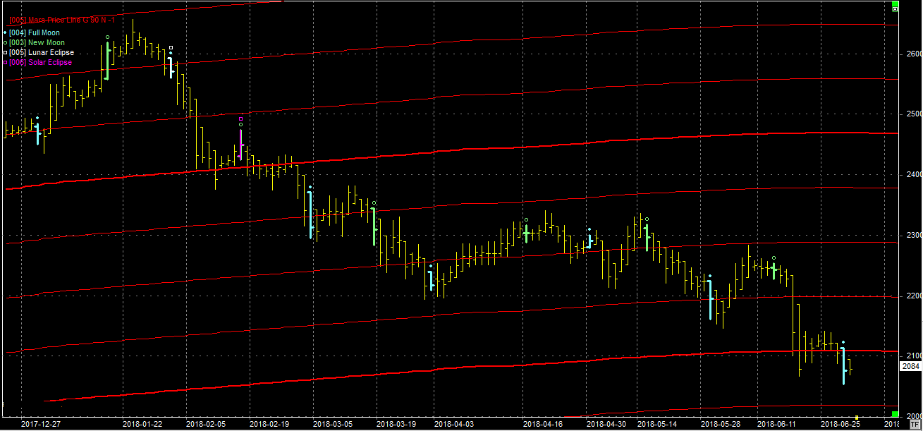 Na wykresie z liniami Marsa mamy naruszenie wsparcia na poziomie 2100 pkt. Na razie jest to tylko naruszenie i zakładam dalszą walkę o ten poziom. Ostatnia pełnia może pomagać bykom, jako element zwroty. Jeśli uda się wybronić omawianą linię to następny opór jest na poziomie 2200 pkt. Jeśli pełnia nie zadziała, to czeka nas obrona psychologicznego poziomu 2000 pkt.
