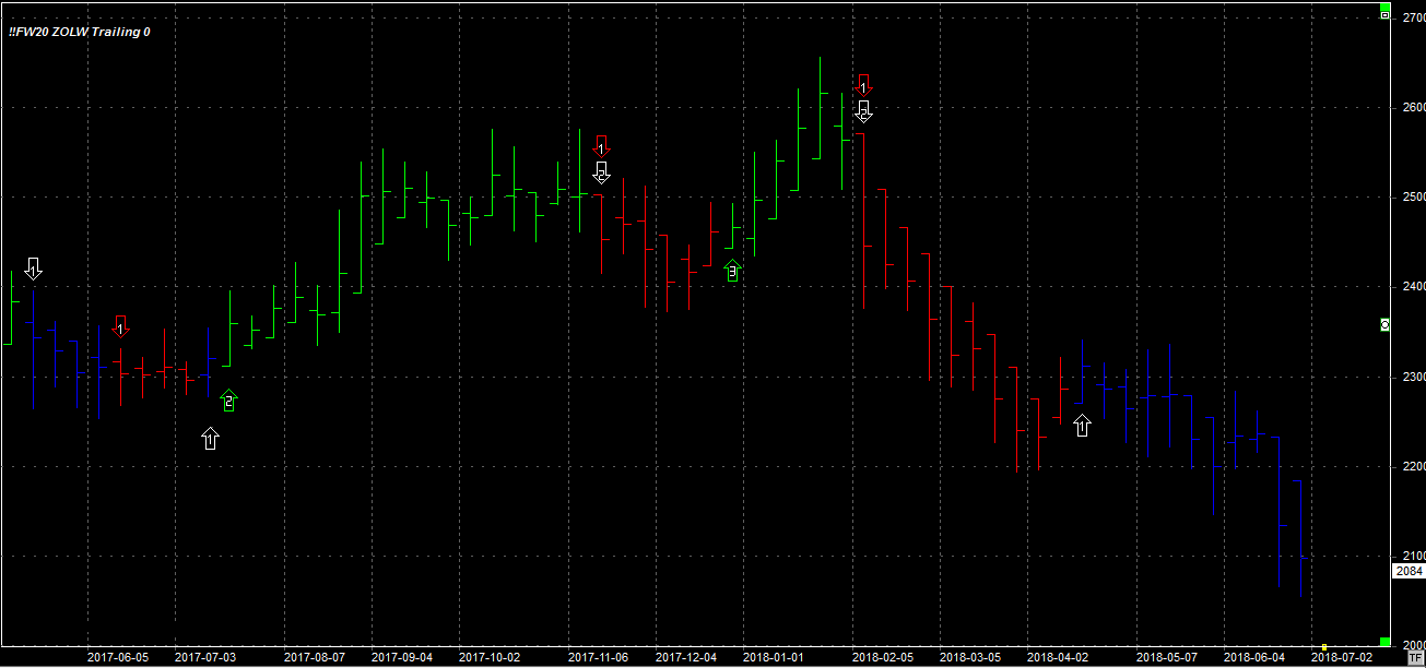 Tydzień zamknął się na poziomie 2084 pkt., 43 pkt. niżej niż tydzień temu. System w pozycji neutralnej. Niestety musimy poczekać na sygnał kupna, gdyż system nie ponawia wystopowanych pozycji w tym samym kierunku. Do momentu pojawienia się takiego sygnału, system będzie poza rynkiem.
