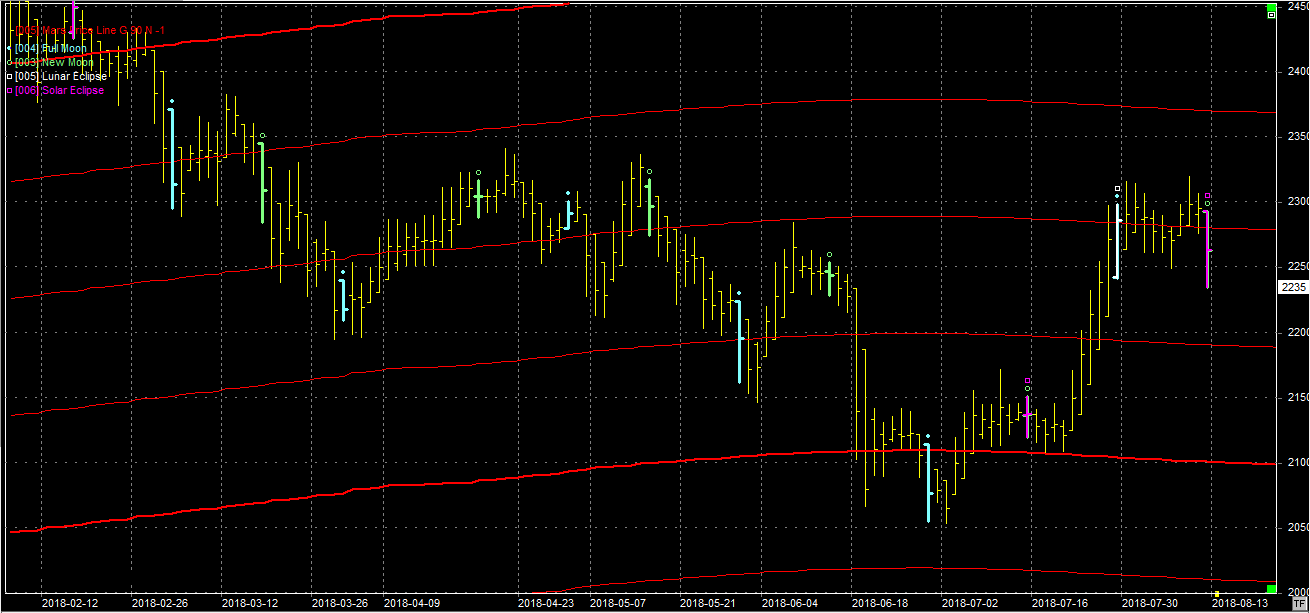 Na wykresie z liniami Marsa widzimy wyraźnie, że byki nie dają sobie rady z oporem na poziomie 2280 pkt. Mamy odejście spadkowe od oporu, które jest dodatkowo wzmacniane nowiem na zaćmieniu słońca, który miał miejsce 11.08.18. To element zwrotny i może zakończyć korektę, jak i ją zapoczątkować. Wydaje mi się, że bardziej prawdopodobne jest to drugie i zobaczymy zejście w okolice wsparcia na 2190 pkt. Tam byki muszą się zebrać do kupy i wyprowadzić kolejną falę wzrostową. Jeśli to nie nastąpi, to całe ostatnie odbicie trzeba będzie traktować jako korekta w spadkach.