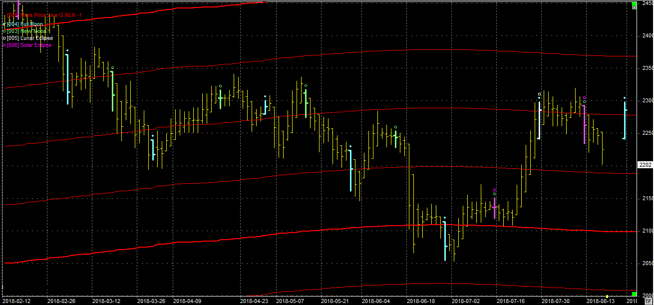 Na wykresie z liniami Marsa widzimy wyraźnie, że byki nie dają sobie rady z oporem na poziomie 2280 pkt. Mamy odejście spadkowe od oporu, które jest dodatkowo wzmacniane nowiem na zaćmieniu słońca, który miał miejsce 11.08.18. To element zwrotny i może zakończyć korektę, jak i ją zapoczątkować. Wydaje mi się, że bardziej prawdopodobne jest to drugie i zobaczymy zejście w okolice wsparcia na 2190 pkt. Tam byki muszą się zebrać do kupy i wyprowadzić kolejną falę wzrostową. Jeśli to nie nastąpi, to całe ostatnie odbicie trzeba będzie traktować jako korekta w spadkach.