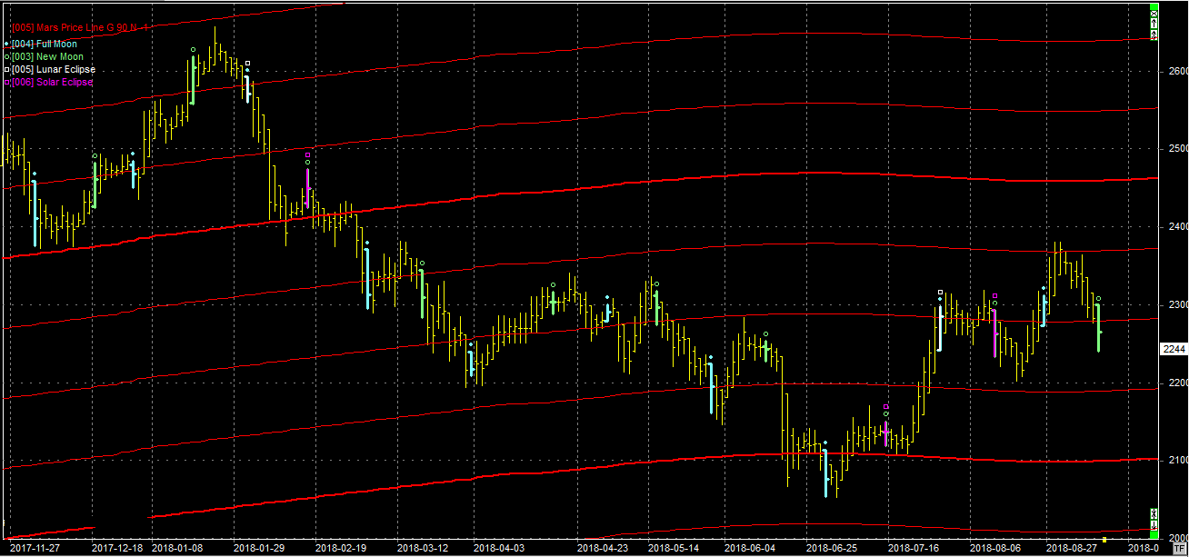 Na wykresie z liniami Marsa widzimy zejście do wsparcia na poziomie 2290 pkt. Jest ono już naruszone i dalszy spadek będzie oznaczał test niższego wsparcia, znajdującego się na linii Marsa, na poziomie 2200 pkt. Bykom w odwróceniu tendencji może pomagać niedzielny (09.09.18) nów, który jest elementem zwrotnym.