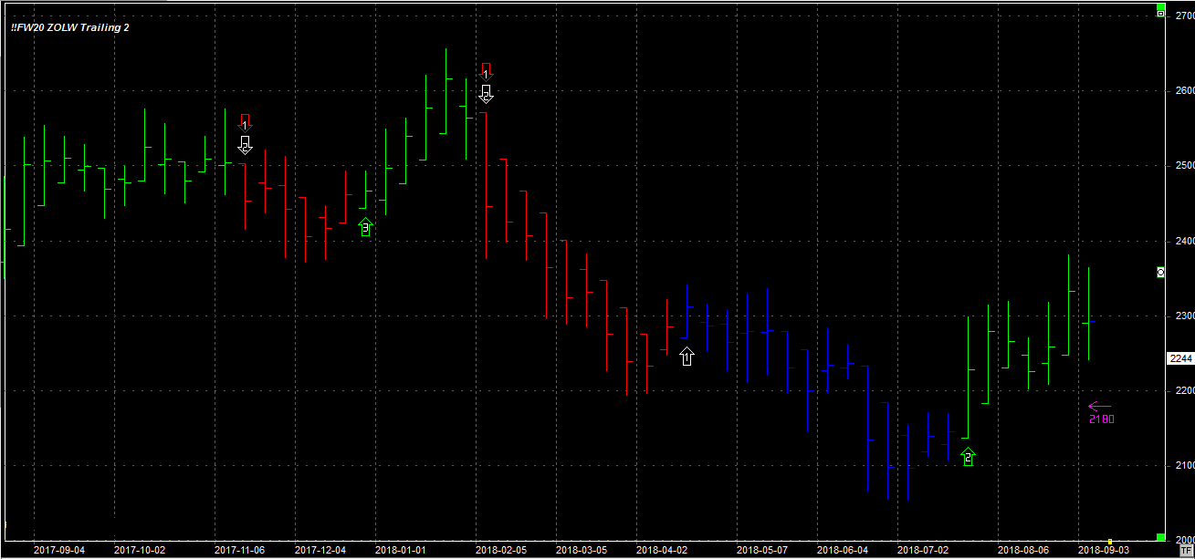 Tydzień zamknął się na poziomie 2244 pkt., 85 pkt. niżej niż tydzień temu. System utrzymuje dwie pozycje długie po 2276 pkt. Stop 2180.