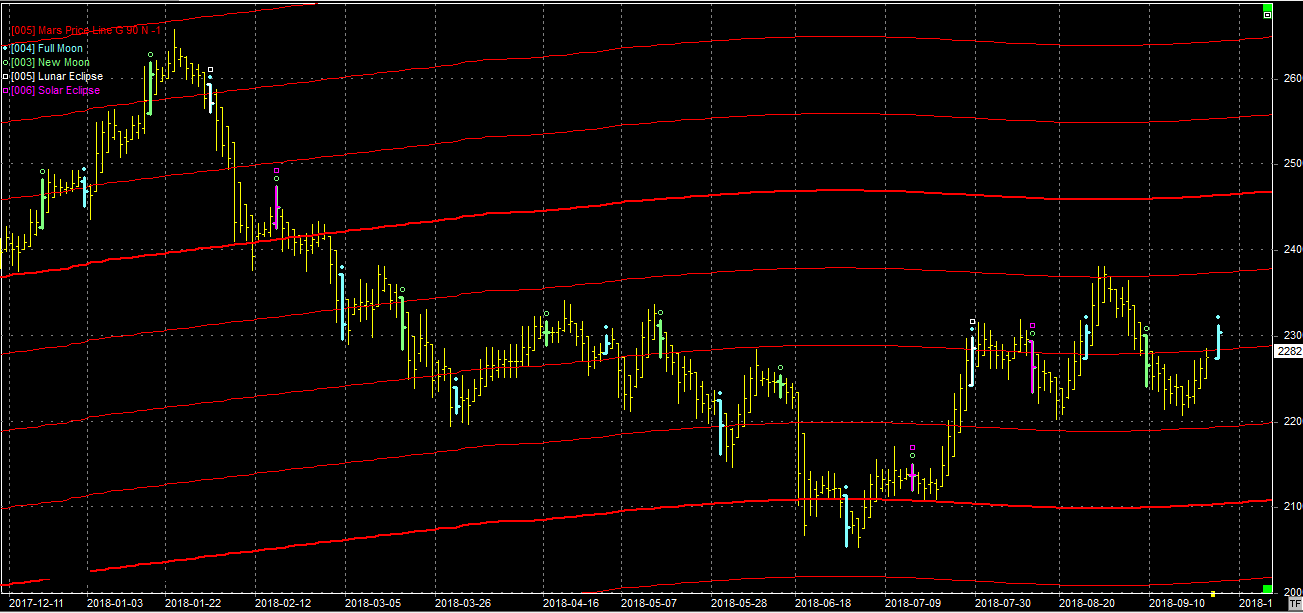 Na wykresie z liniami Marsa kurs zawrócił tuż nad wsparciem na poziomie 2200 pkt. Niestety koniec serii kontraktów utrudnia wyrokowanie o tym, czy to odbicie będzie przedłużone, czy też nie. Faktem jest jednak, ze kurs dotarł do przełamanego niedawno wsparcia na poziomie 2290 pkt., który jest obecnie oporem. Jego pokonanie może świadczyć o intencjach byków związanych z zakończeniem roku na wyższych poziomach. Jeśli się od niego odbijemy, to powstanie formacja RGR, oznaczająca dalsze kłopoty strony popytowej, Na niebie we wtorek 25.09 będziemy mieli pełnię, która jest elementem zwrotnym i może zawrócić dotychczasowy kierunek.