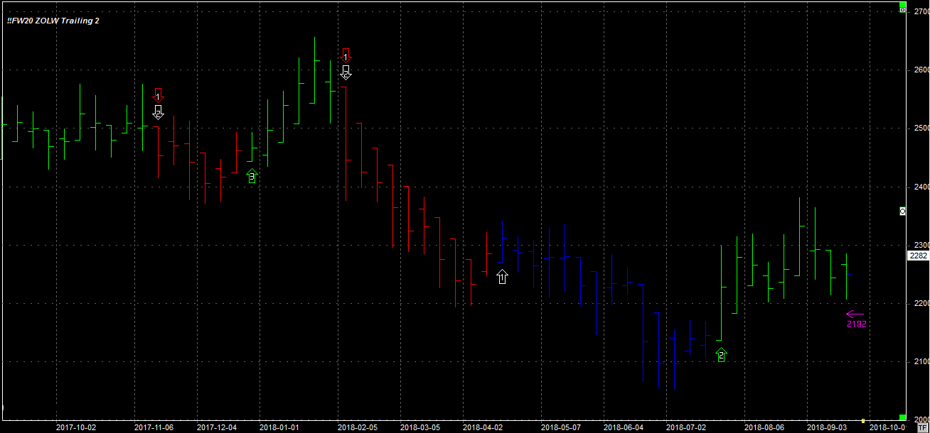 Tydzień zamknął się na poziomie 2282 pkt., 47 pkt. wyżej niż tydzień temu. System utrzymuje dwie pozycje długie po 2276 pkt. Stop 2182.