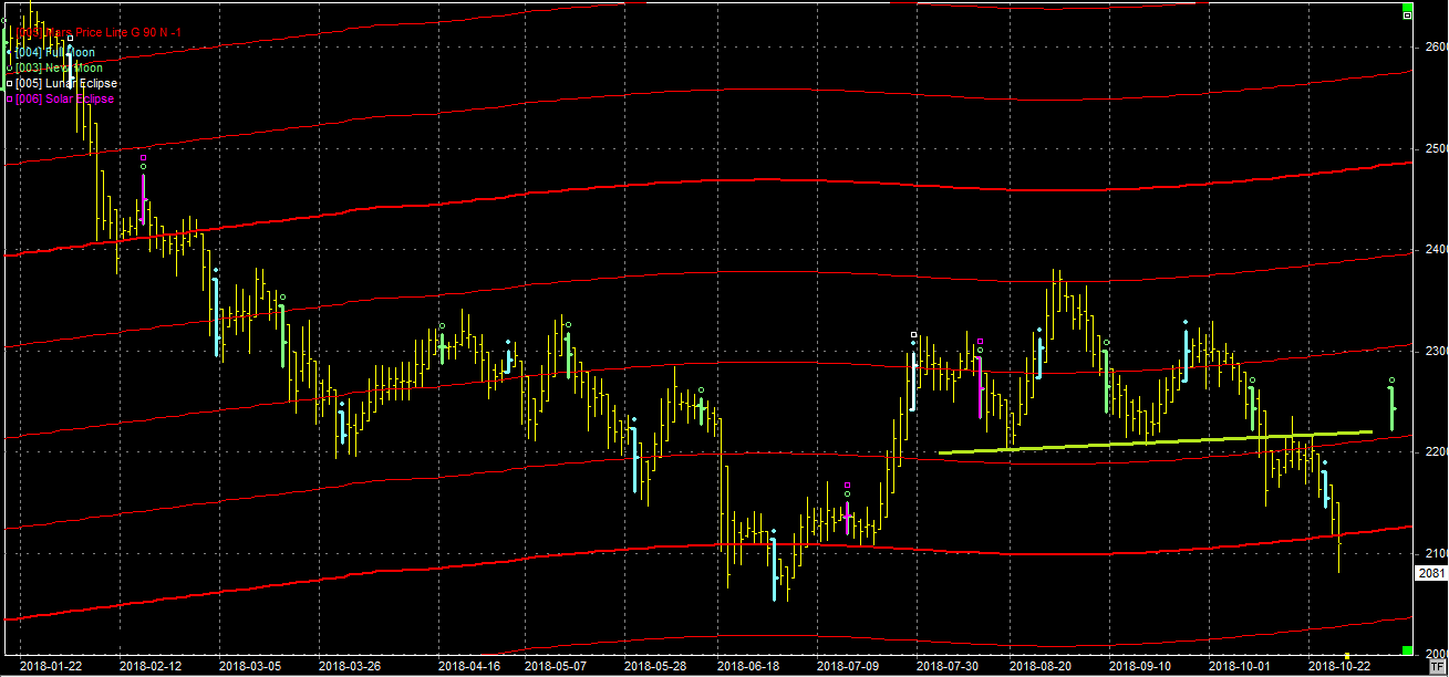Na wykresie z liniami Marsa widzimy, że rynek zachował sie klasycznie. Po re-teście linii szyi RGRa rynek pomaszerował w dół. Techniczny zasięg formacji to poziom 2030 pkt., więc jeszcze trochę zostało. Dodatkowo w tych okolicach przebiega wsparcie wynikające z kolejnej linii Marsa. Obecnie testowaną, w okolicach 2120 pkt. raczej trzeba spisać na straty.