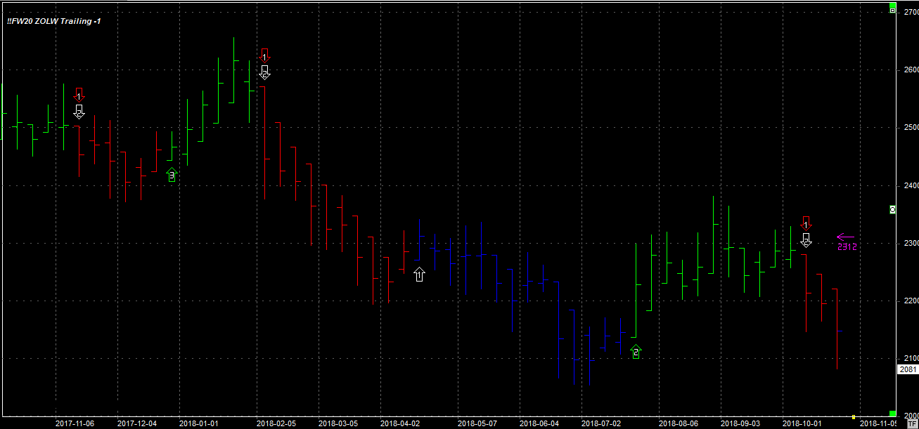 Tydzień zamknął się na poziomie 2081 pkt., 121 pkt. niżej niż tydzień temu. System utrzymuje pozycję krótką po 2185 pkt. Stop dla pozycji 2312 pkt.