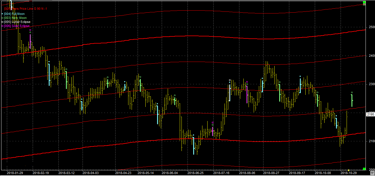 Na wykresie z liniami Marsa widać, że linia na poziomie 2120 pkt. została obroniona. To trochę dziwne, bo techniczny zasięg, wynikający z formacji RGR nie został osiągnięty. Jest ok. 100 pkt. niżej. Obecnie rynek testuje opór na poziomie 2210 pkt. Od tego czy zostanie pokonany zależeć będzie czy formacja RGR zostanie złamana, dając silny sygnał kupna, czy jednak zostanie zrealizowana. Na niebie 7.11.18 będziemy mieli nów, który może zmienić dotychczasowy kierunek ruchu.