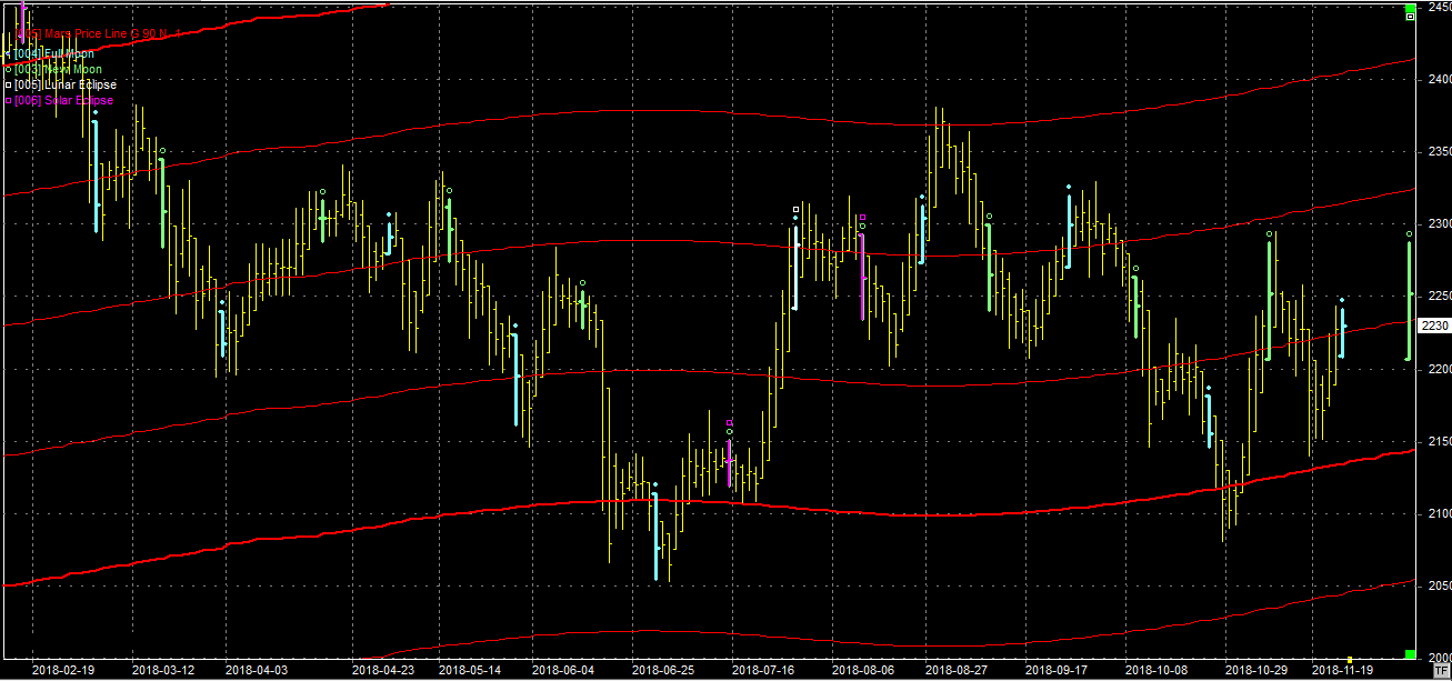 Na wykresie z liniami Marsa bykom udało się obronić linię wsparcia na poziomie 2140 pkt. i podciągnąć kurs do najbliższego oporu, na poziomie 2230 pkt. W takiej sytuacji trudno wyrokować o dalszych ruchach. Osobiście uważam, ze koniec roku powinien sprzyjać bykom i zakładam ponowny ruch w okolice oporu na poziomie 2330 pkt. Tyle klasyczne zachowanie w końcu roku. Na niebie w piątek była pełnia, która może wyznaczyć szczyt obecnego odbicia.