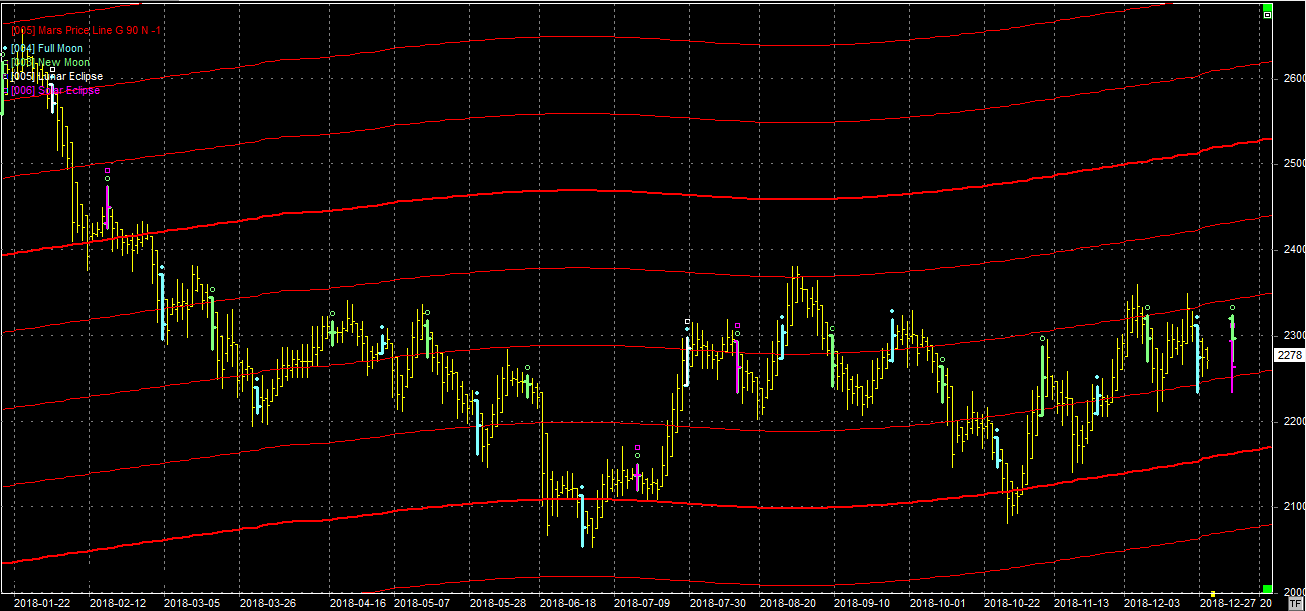 Na wykresie z limami Marsa mamy ponowny test wsparcia na poziomie 2250 pkt. Tym razem wypadł niemal na pełni Księżyca, która uściśliła się 22.12.18. Może to być ważne minimum w kontekście początku przyszłego roku. Ten już chyba przyjdzie spisać na straty, chyba że byki urządzą kilkusesyjny rajd po 3%. W trzy sesje 10%? W końcu roku wszystko możliwe.