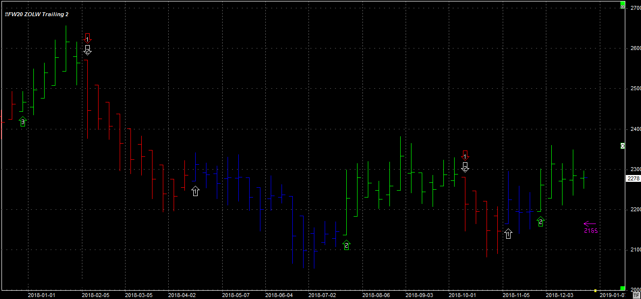Tydzień zamknął się na poziomie 2278 pkt., 27 pkt. wyżej niż tydzień temu. System utrzymuje dwie długie pozycje (zgodnie z trendem) po 2295 pkt. Stop dla pozycji 2165 pkt.
