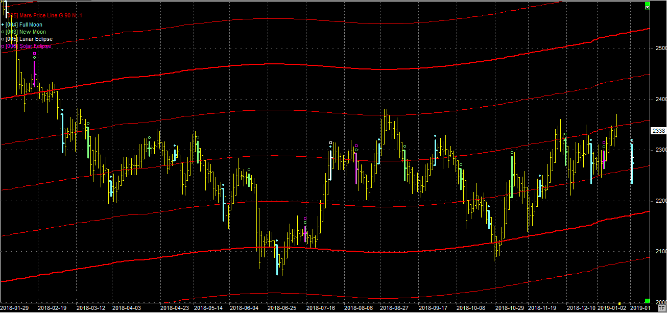 Na wykresie z liniami Marsa widzimy trzeci już atak na opór na poziomie 2360 pkt. Są szanse na to, że tym razem będzie udany. Czasu jest sporo, bowiem następna pełnia, wzmocniona zaćmieniem Księżyca, wypada dopiero 21.01.19. Następny opór znajduje się na poziomie 2450 pkt.