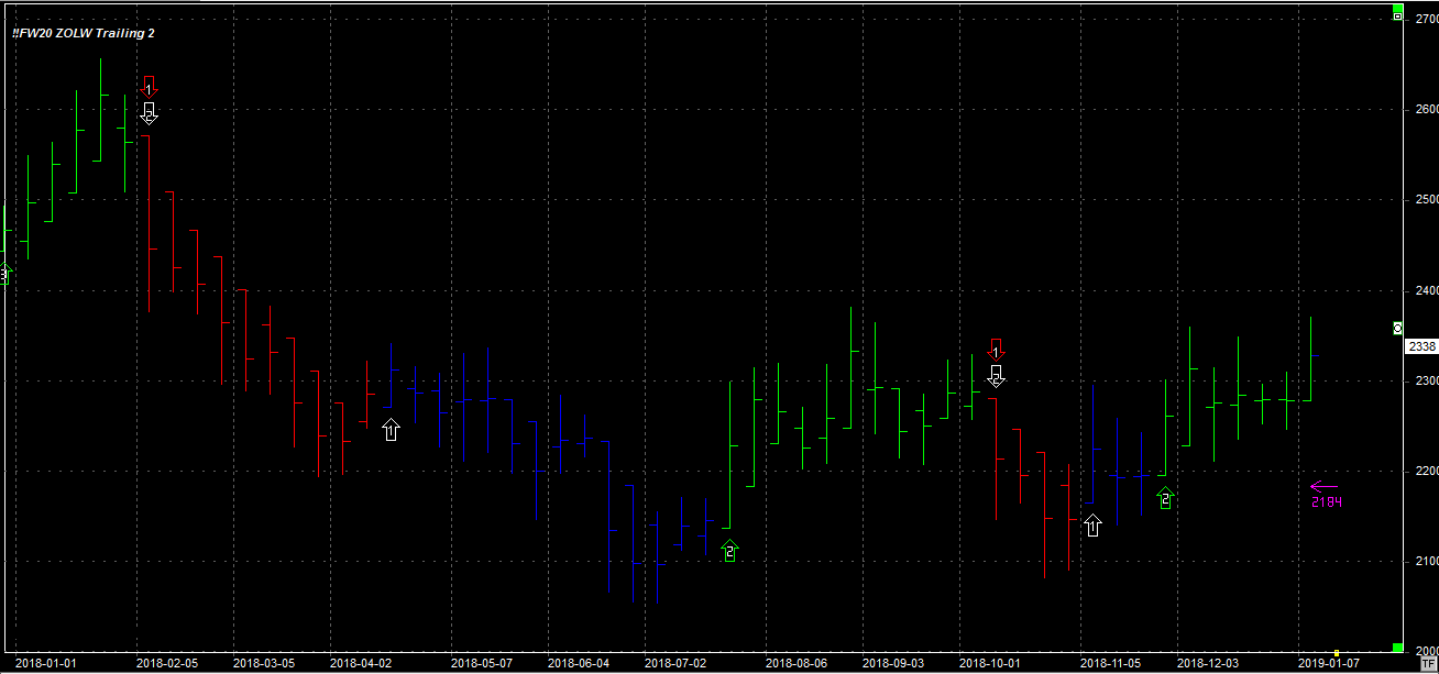 Tydzień zamknął się na poziomie 2338 pkt., 49 pkt. wyżej niż tydzień temu. System utrzymuje dwie długie pozycje (zgodnie z trendem) po 2295 pkt. Stop dla pozycji 2184 pkt.