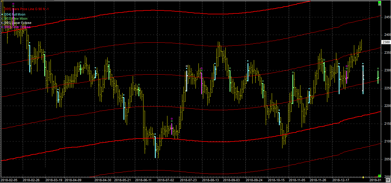 Na wykresie z liniami Marsa widzimy trzeci już atak na opór na poziomie 2360 pkt. Są szanse na to, że tym razem będzie udany. Czasu jest sporo, bowiem następna pełnia, wzmocniona zaćmieniem Księżyca, wypada dopiero 21.01.19. Następny opór znajduje się na poziomie 2450 pkt.