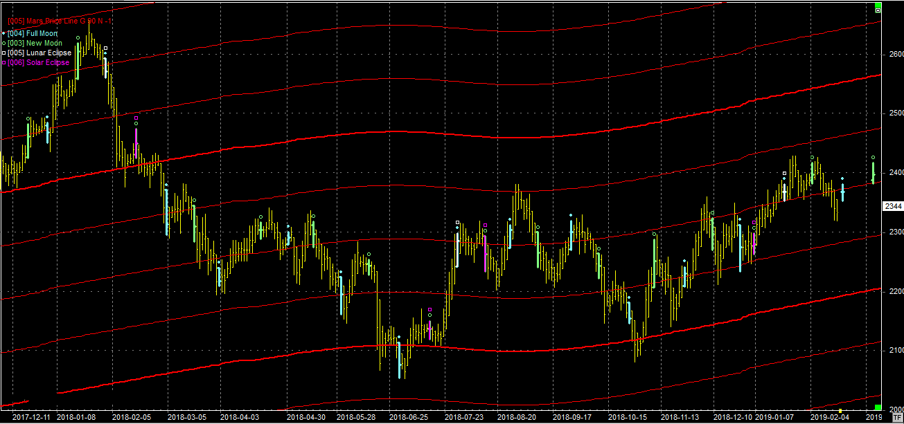 Na wykresie z liniami Marsa wygląda, że byki utraciły wsparcie na poziomie 2370 pkt. Kolejne jest na poziomie ok. 2300 pkt. choć może jeszcze uda się rynek wyciągnąć ponad to pierwsze. Pomagać może pełnia, która wypada we wtorek 19.02. Jeśli ten element zwrotny nie powstrzyma spadków, to atak na 2300 pkt. będzie nieunikniony.