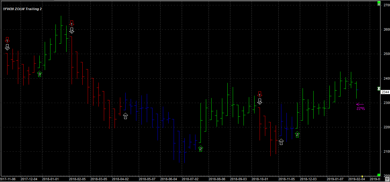 Tydzień zamknął się na poziomie 2344 pkt., 16 pkt. niżej niż tydzień temu. System utrzymuje dwie długie pozycje (zgodnie z trendem) po 2295 pkt. Stop dla pozycji 2295 pkt.