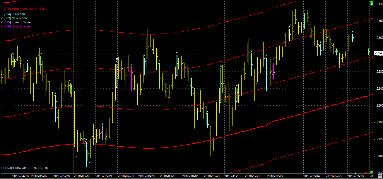 Na wykresie z liniami Marsa bykom nie udało się dotrzeć do oporu na poziomie 2400 pkt. Rynek zawrócił niemal dokładnie na pełni połączonej z przesileniem wiosennym. Obecnie byki czeka walka o utrzymanie wsparcia na poziomie 2290 pkt. Jeśli się to nie uda, to następna linia jest na poziomie 2230 pkt.