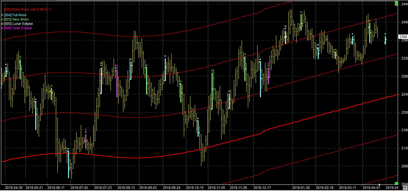 Na wykresie z liniami Marsa kurs dotarł do oporu na poziomie 2420 pkt. i dość ostro zawrócił. Być może piątkowy nów, jako element zwrotny, powstrzyma dalszy spadek i skłoni byki do ponownego ataku na opór? Zobaczymy. Przebicie tego oporu dałoby szansę na dojście do następnego - 100 pkt. wyżej. Wsparcie na poziomie 2320 pkt. i podnosi się z każdym dniem.