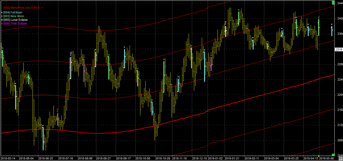 Na wykresie z liniami Marsa widzimy zejście do wsparcia na poziomie 2330 pkt. Jest ono obecnie testowane, ale jeszcze nie definitywnie przełamane. Naruszenie w skróconym, świątecznym tygodniu zignorowałbym. Rzeczywistą kondycję byków poznamy dopiero w nadchodzącym tygodniu. Jeśli wsparcie padnie to czeka nas ruch w okolice kolejnego wsparcia, obecnie na poziomie 2250 pkt. Opór na poziomie 2440 pkt. Odwrócenie tendencji może prowokować niedzielny nów (05.05.2019).