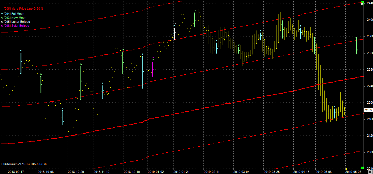 Na wykresie z liniami Marsa kurs konsoliduje się na wsparciu na poziomie 2180 pkt. Na razie nie ma ochoty odbić, mimo solidnych wzrostów od dołka na rynkach bazowych. Byli mogą jednak pokładać nadzieję w sobotniej pełni, która może odwrócić tendencję. Jeśli się uda, to pierwszy opór jest na poziomie 2260 pkt. Kolejne wsparcie, w przypadku przełamania obecnego, na 2080 pkt.