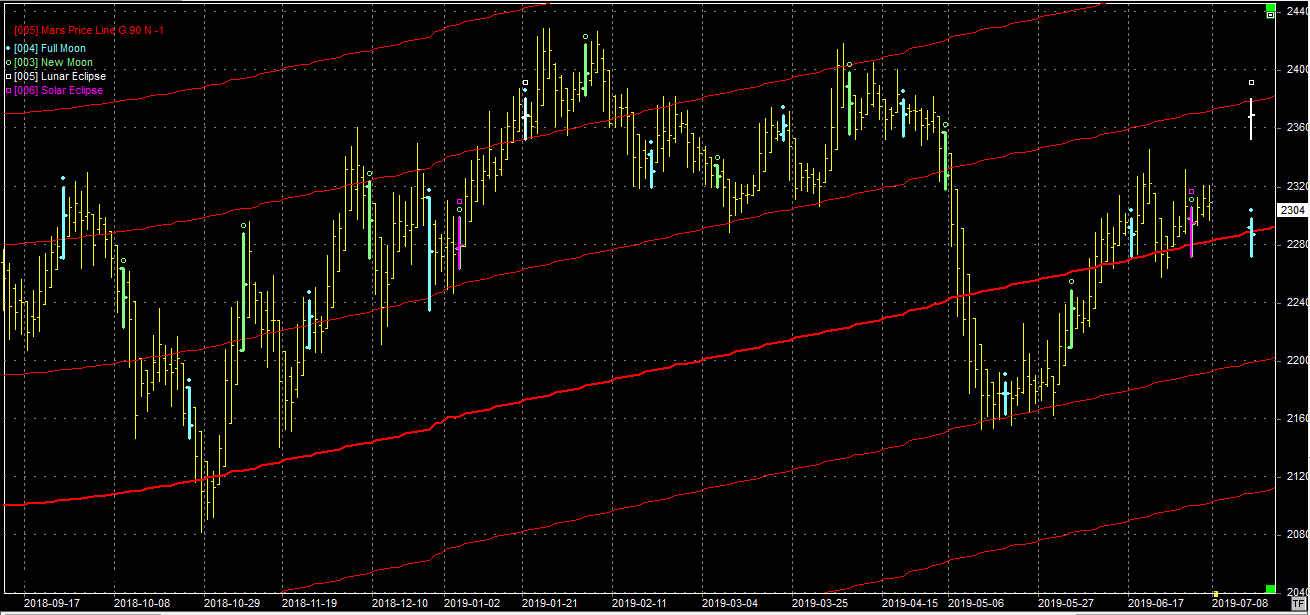 Na wykresie z liniami Marsa widzimy walkę o wsparcie na poziomie 2290 pkt. Na razie jest ono bronione. Uwaga na wtorek, który może przynieść gwałtowne zmiany z uwagi na nów na zaćmieniu Słońca. Najbliższy opór jest na poziomie 2390 pkt.