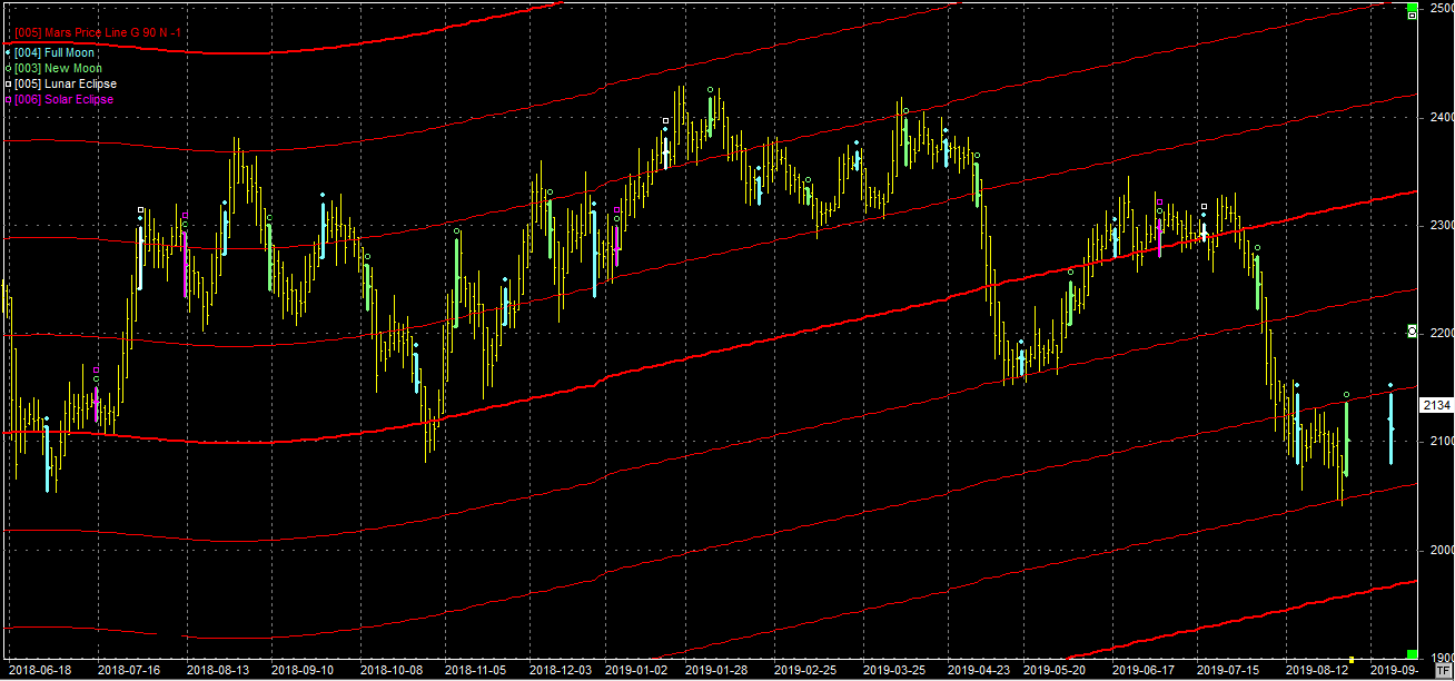 Na wykresie z liniami Marsa widać próbę powrotu ponad linię na poziomie 2130 pkt. Niestety próba jest na razie nieudana, a linia zaczyna pracować jako opór. Do tego nasz parkiet nie zdążył zareagować na ostatnie tweety Trumpa, stąd o tym poziomie wsparcia raczej możemy już zapomnieć. Zostanie najprawdopodobniej utracony. Kolejne są na poziomie 2050 pkt. i niżej, bardzo ważny, na poziomie 1960 pkt. Na niebie będziemy mieli nów, który uściśla się 30.08.19. Do tego czasu raczej nie oczekuję odwrócenia tendencji.