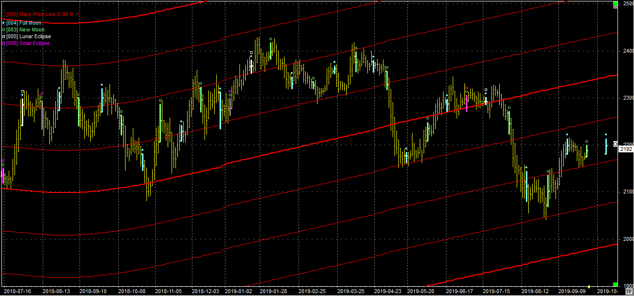 Na wykresie z liniami Marsa ostatnia pełnia najprawdopodobniej wyznaczyła szczyt podejścia wzrostowego. Przynajmniej w krótkim terminie. Nie udało się więc bykom nawet podejść pod opór na poziomie 2250 pkt. Obecne cofnięcie nie jest jeszcze groźne. Ma miejsce do linii na poziomie 2150 pkt. Jej przebicie będzie oznaczało kolejną falę spadkową, z opcją na nowe minima.