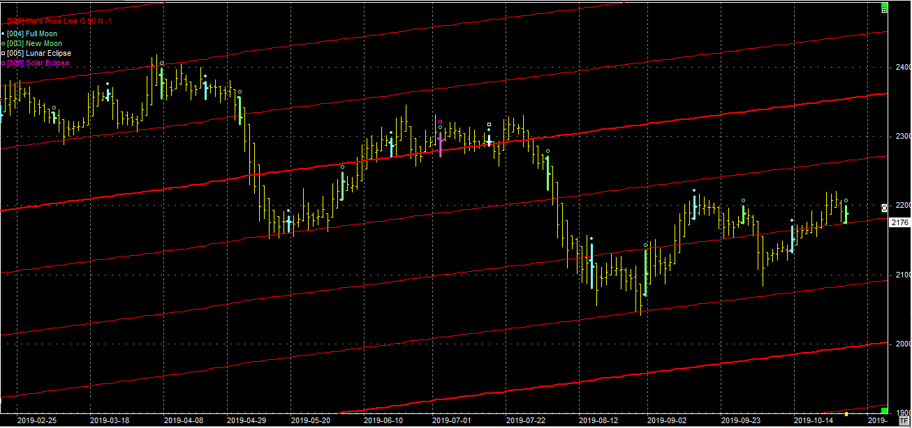 Na wykresie z liniami Marsa sytuacja bez zmian względem poprzedniego wpisu. Kurs nadal jest blisko oporu na 2160 pkt. Komentarz z poprzedniego tygodnia pozostaje ważny.