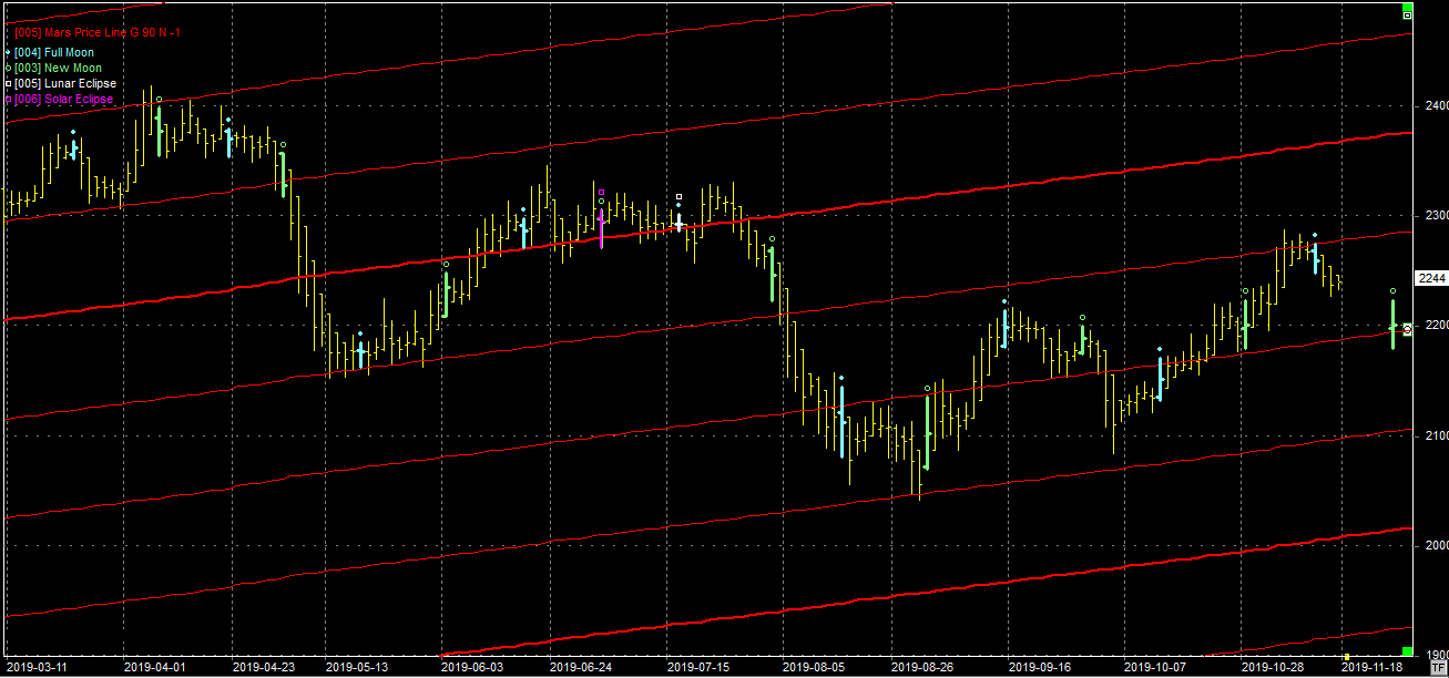 Na wykresie z liniami Marsa widać, że byki nie zdołały uporać się z oporem na poziomie 2260 pkt. Opór był wzmocniony pełnią, więc to nie dziwi. Obecnie kurs zszedł już do połowy zakresu pomiędzy oporem a wsparciem, więc jeśli byki myślą o ponownym ataku na opór, to muszą zawrócić kurs. Wsparcie na poziomie 2200 pkt. Nów dopiero 26.11.19.