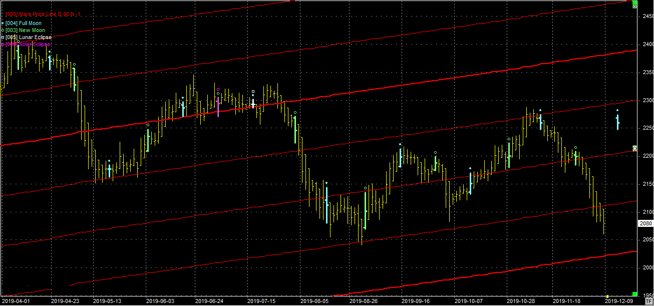 Na wykresie z liniami Marsa widzimy, że rynek przebił wsparcie na poziomie 2110 pkt. i obecnie jest 30 pkt. niżej. Rynek jest tak słaby, że nawet nie powalczył na tej linii. Następne wparcie jest na poziomie 2020 pkt. Pozostaje mieć nadzieję, że pełnia , która się uściśla 12.12.19 zmieni tendencję, choćby na krótko. Wg mnie jednak fundusze chcę zamknąć ten rok nisko, spisując go na straty i mieć niską bazę na rok następny. W takich warunkach trudno o trwalszy wzrost.