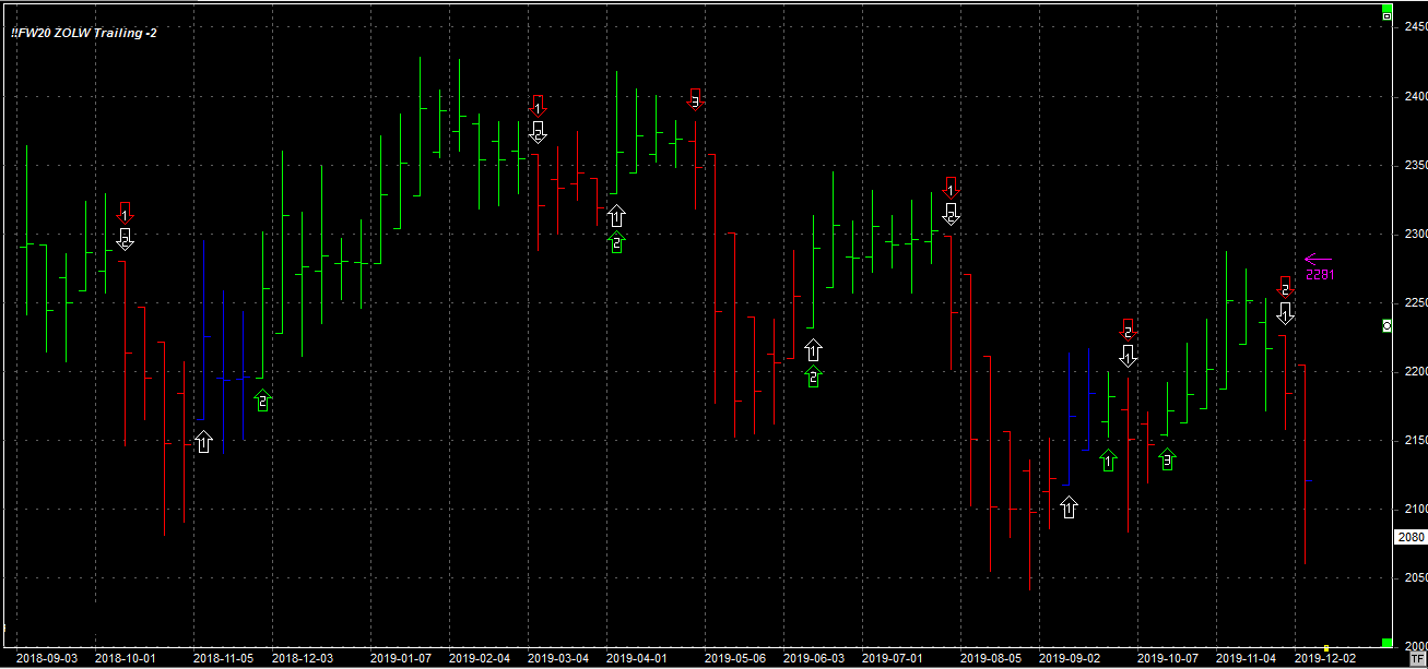 Tydzień zamknął się na poziomie 2080 pkt., 82 pkt. niżej niż tydzień temu. System utrzymuje pozycję krótką - 2 szt. po 2162 pkt. Stop dla pozycji 2281 pkt.