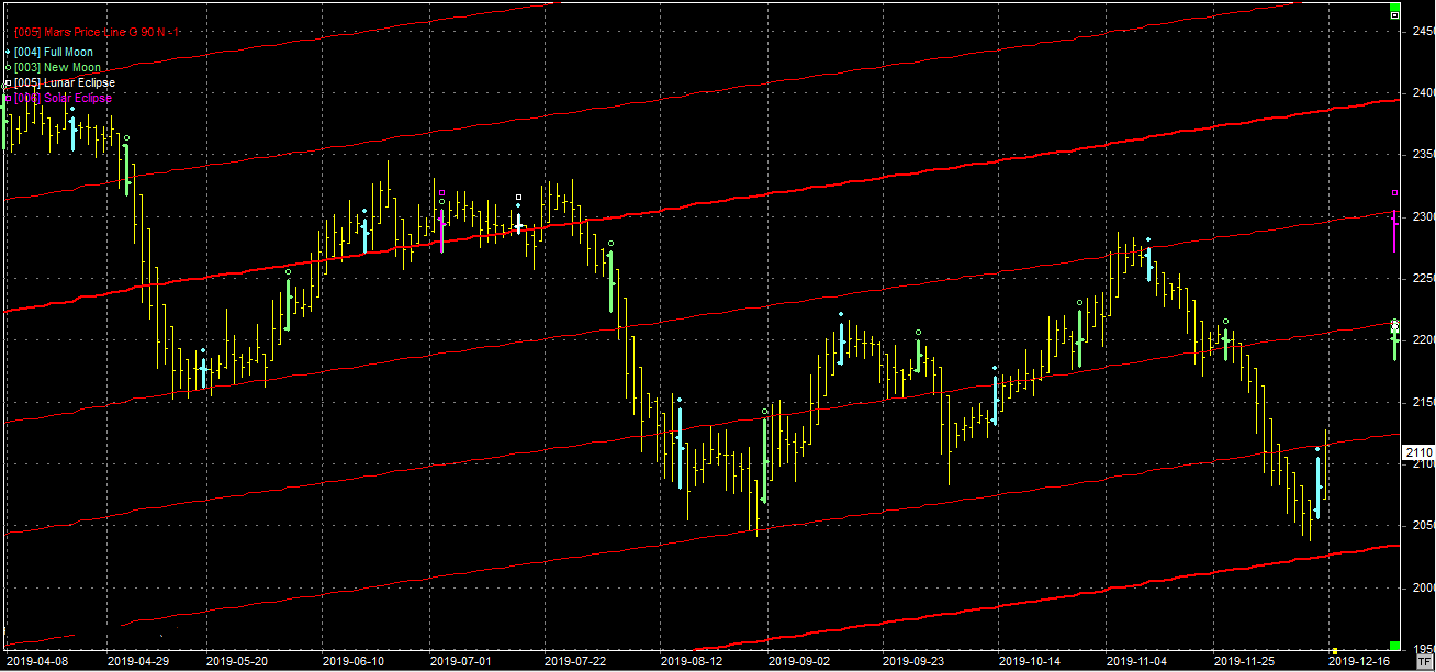Na wykresie z liniami Marsa widzimy, że rynek przebił wsparcie na poziomie 2110 pkt. i obecnie jest 30 pkt. niżej. Rynek jest tak słaby, że nawet nie powalczył na tej linii. Następne wparcie jest na poziomie 2020 pkt. Pozostaje mieć nadzieję, że pełnia , która się uściśla 12.12.19 zmieni tendencję, choćby na krótko. Wg mnie jednak fundusze chcę zamknąć ten rok nisko, spisując go na straty i mieć niską bazę na rok następny. W takich warunkach trudno o trwalszy wzrost.