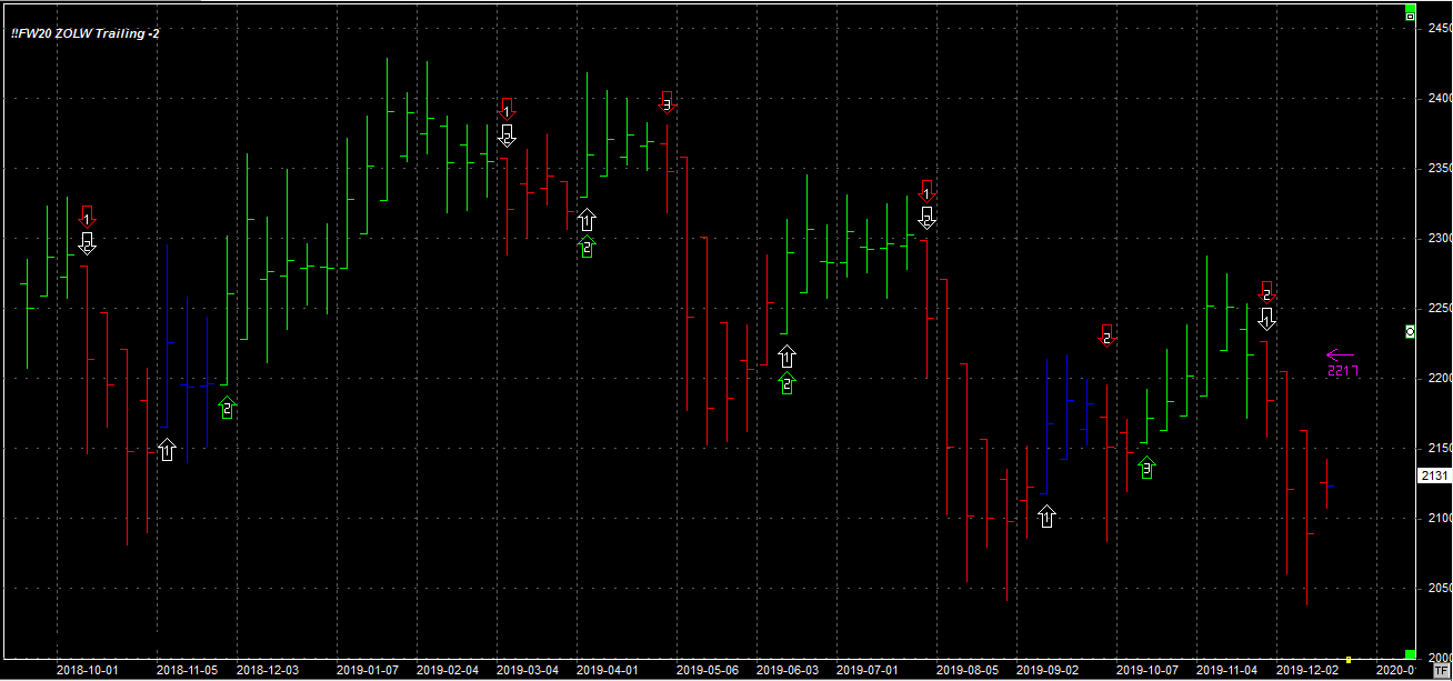 Tydzień zamknął się na poziomie 2131 pkt., 21 pkt. wyżej niż tydzień temu. System utrzymuje pozycję krótką - 2 szt. po 2162 pkt. Stop dla pozycji 2217 pkt.