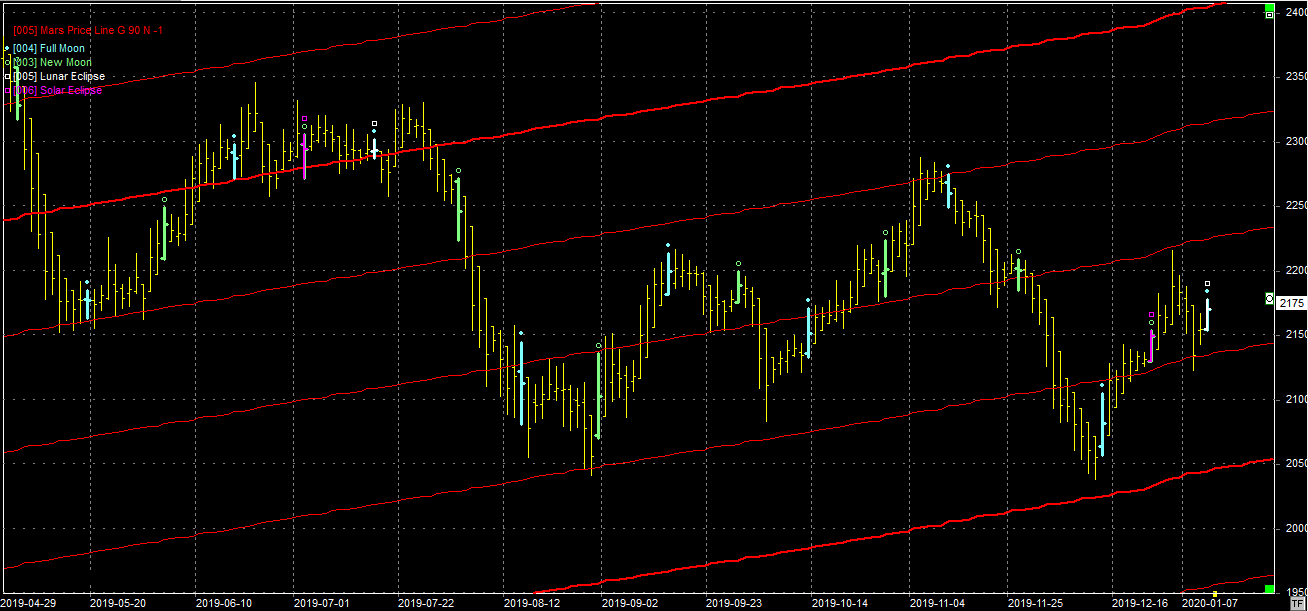 Na wykresie z liniami Marsa widzimy, że kurs dotarł do oporu na poziomie 2220 pkt. i dość łatwo ten poziom oddał. Wspominałem w poprzednim wejściu o stylu podejścia, który nie gwarantował jego trwałości. Obecnie kurs spadł ponownie do wsparcia na poziomie 2130 pkt. i lekko się od niego odbił. Wg mnie, jeśli kurs ma ponownie zaatakować opór, to powinien porządnie ubić dno na tym poziomie, przed kolejnym atakiem. Przebicie wsparcia będzie skutkowało ruchem w okolice kolejnego, na poziomie 2050 pkt. Na niebie, w piątek 10.01.20, była pełnia na zaćmieniu Księżyca. Mogła ona zakończyć wzrostowe odbicie od wsparcia.