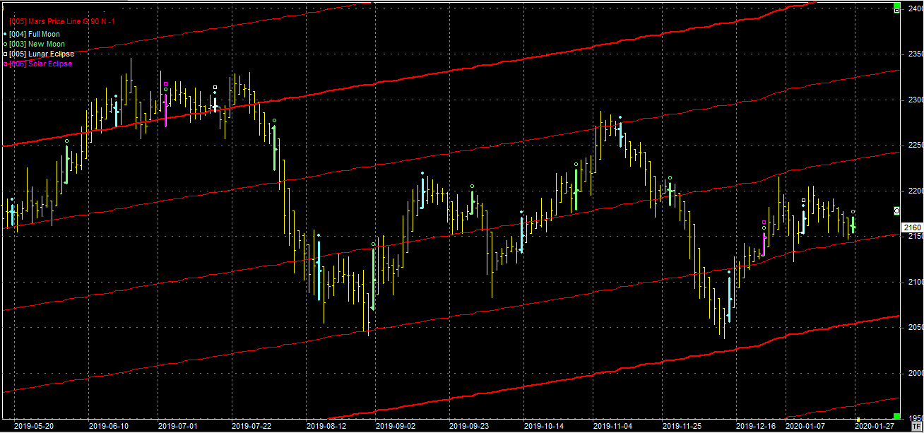 Na wykresie z liniami Marsa w zasadzie niewiele się zmieniło względem poprzedniego tygodnia. Kurs utknął w połowie dystansu pomiędzy wsparciem na 2140 pkt., a oporem na 2230 pkt. Wg mnie byki powinny zaatakować ponownie opór jeszcze w styczniu. Na niebie w nadchodzącym tygodniu będzie nów. Dokładnie wypadnie w piątek, 24.01.20. Do tego czasu byki mogą spokojnie kontynuować podejście.