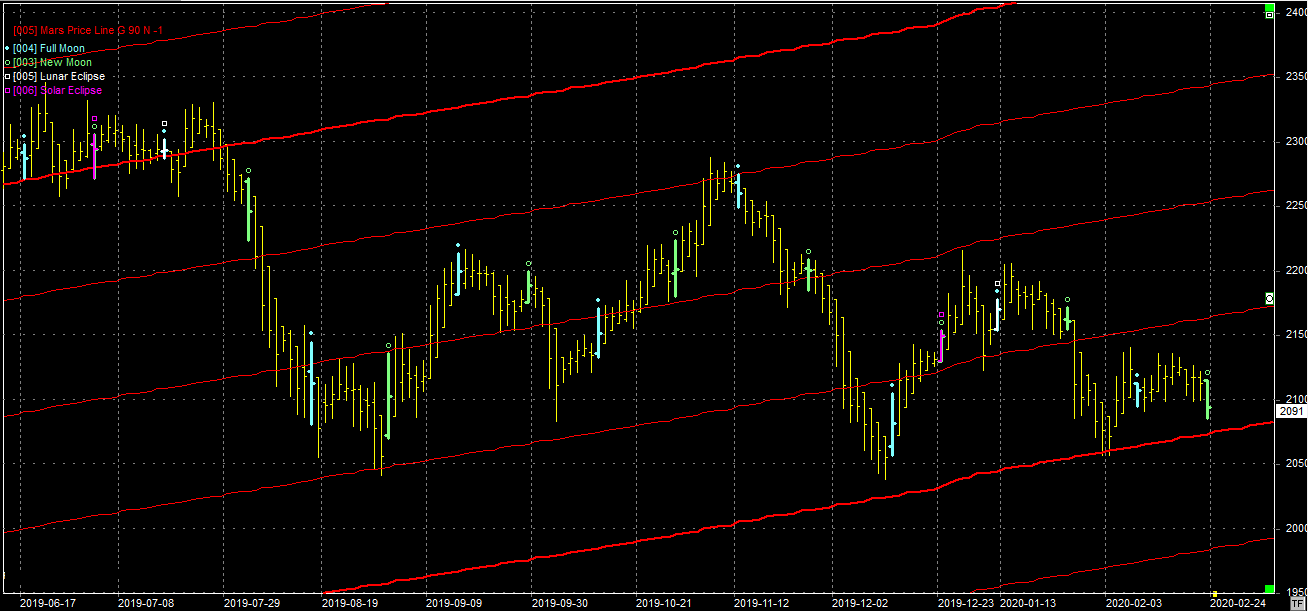 Na wykresie z liniami Marsa w zasadzie niewiele zmieniło się względem zeszłego tygodnia. Nadal najbardziej prawdopodobnym scenariuszem jest podążanie kursu w kierunku oporu na linii Marsa, na poziomie 2160 pkt. Byki mają czas do 23.02.20, kiedy to na niebie uściśli się nów. Ten jako element zwrotny może zmienić kierunek w krótkim terminie.