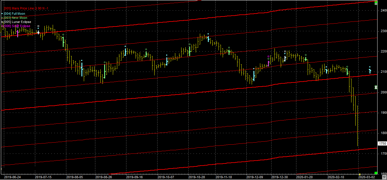 Na wykresie z liniami Marsa przełamanie bardzo ważnego wsparcia na poziomie 2080 pkt. skutkuje wodospadem. Realia są więc takie, że zwiedzamy tereny ostatni raz zwiedzane w 2016 roku. Obecnie kurs dotarł do wsparcia w okolicach linii na poziomie 1730 pkt. Po takich spadkach powinno to prowokować przynajmniej do jakiejś korekty. O końcu spadku raczej nie ma mowy, gdyż do tego konieczny jest proces ubijania dna.
