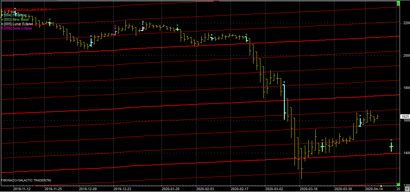 Na FW20 niewiele zmian względem zeszłego tygodnia. Kurs porusza się w trendzie horyzontalnym, pomiędzy wsparciem na poziomie 1580 pkt. a oporem na poziomie 1660 pkt. W teorii kurs powinien wyjść z horyzontu zgodnie z kierunkiem wejścia do niego, a więc górą. Byki mają czas na to do 23.04, kiedy to uściśla się nów. Następny opór powyżej obecnego jest na linii Marsa na poziomie 1750 pkt.