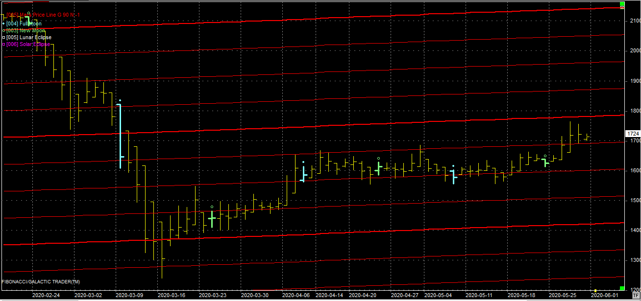 Na wykresie z liniami Marsa, w mijającym tygodniu, kurs przebił pierwszy opór na poziomie 1690 pkt. i dotarł niemal do kolejnego na poziomie 1780 pkt. Z tego poziomu rozpoczęła się korekta, która jednak zeszła jedynie do wsparcia na przełamanym uprzednio oporze. To podstawa do optymizmu i prognozowania kontynuacji ruchu wzrostowego. Opory na 1780 pkt. i wyżej na 1870 pkt. Wsparcie na 1690 pkt.