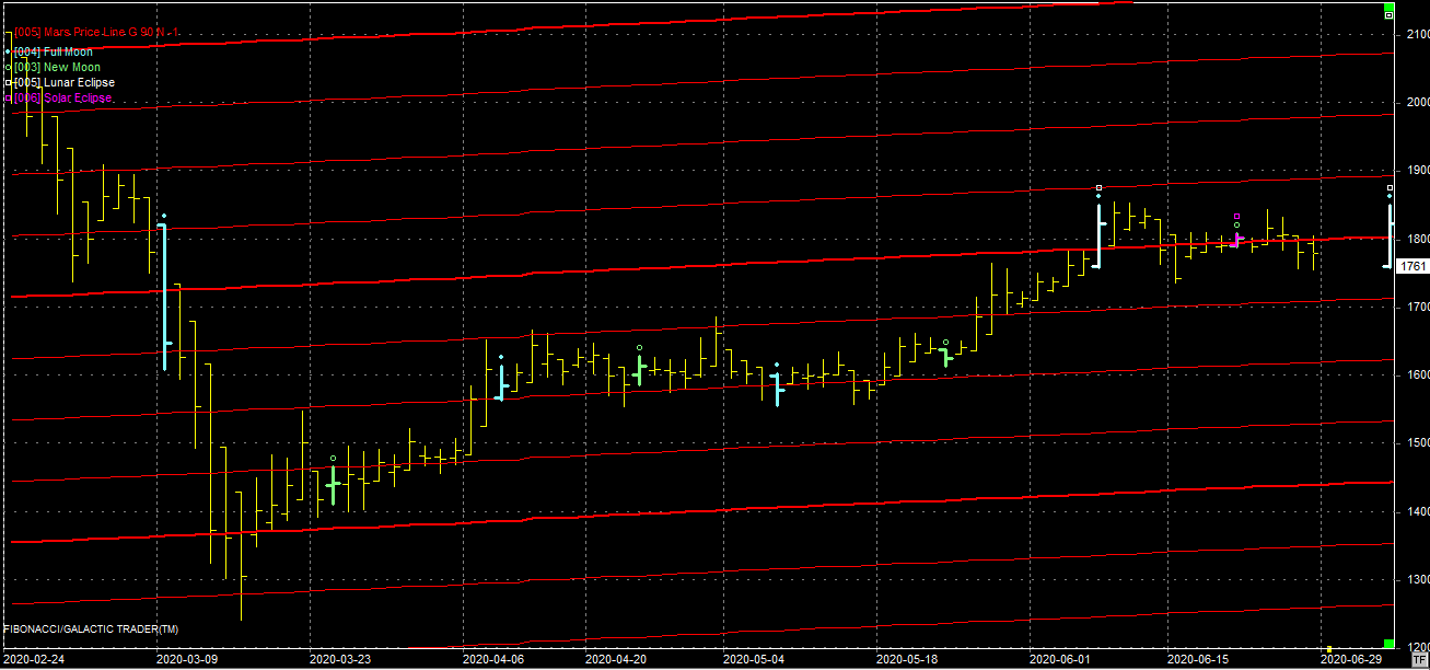 Na wykresie z linami Marsa widać, że kurs stara się powrócić ponad wsparcie na poziomie 1800 pkt. Idzie to jednak jak po grudzie, a niedzielne zaćmienie Słońca na nowiu może zakończyć te próby. W takim wypadku można oczekiwać ruchu w kierunku kolejnego wsparcia, na poziomie 1700 pkt.